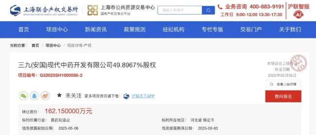 近日,上海联合产权交易所挂牌信息显示,华润三九挂牌转让三九(安国)现代中药开发有限公司49.8967%股权,转让底价162.15万元,信息披露期满日为2025年6月3日。