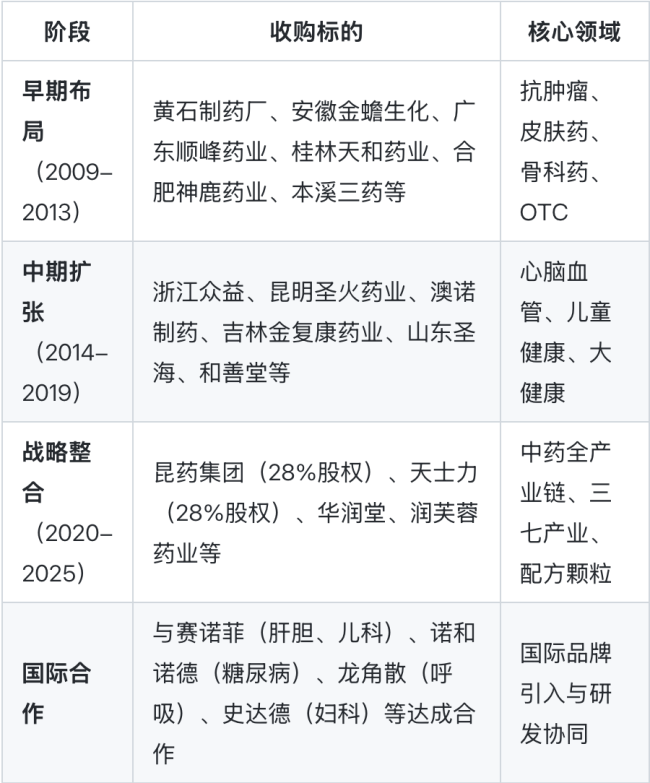 据国金证券统计,2009年,华润三九收购黄石,丰富了儿科、妇科及胃肠道系统管线产品,以及金蟾生化,丰富了抗肿瘤产品;2011年,收购神鹿、高科、本溪,丰富了呼吸道、胃肠道、心血管系统及儿科、抗肿瘤产品;2012年,收购顺峰药业,引入“顺峰康王”、“顺峰宝宝”等产品,拓展了功效性护肤品等管线;2013年,收购桂林天和,引入天和追风膏等骨科产品及其他医疗器械产品;2014年,收购老桐君,进一步丰富呼吸道、胃肠道、心血管等品类产品;2015年,收购浙江众益,丰富抗生素及胃肠道产品;2016年,收购昆明圣火,丰富了心脑血管产品及其他保健品;2020年完成澳诺收购,引入“澳诺”、“金辛金丐特”明星儿科保健品牌,以及收购润生药业、华润堂,丰富呼吸道系统药品、及中药滋补产品;2021年,收购润芙蓉,进一步完善中药领域产品管线。