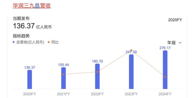 华润三九的“十四五”营收目标是实现营收翻番。其在2020年提出了这一目标,彼时,华润三九的营收为136.37亿元;2021年营收为155.44亿元,2024年达到276.17亿元。如果收入翻番,则需要其营收达到300亿元以上。
