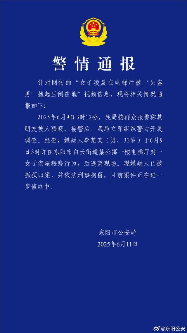 抱压猥亵女子的头盔男被抓 警方3小时速擒嫌疑人。2025年6月9日凌晨3时许,浙江东阳市白云街道某公寓一楼电梯厅发生一起猥亵事件。一名戴头盔的男子趁夜色对一名女子实施猥亵行为,将受害者抱起后按压在地。东阳警方接警后迅速行动,仅用3小时便将33岁的犯罪嫌疑人李某某抓获,并依法予以刑事拘留。