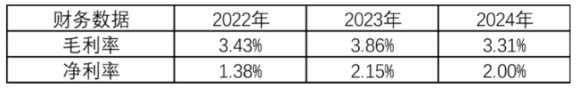 所以毛利率和净利率极其之低,2024年毛利率只有3.31%,净利率只有2%。