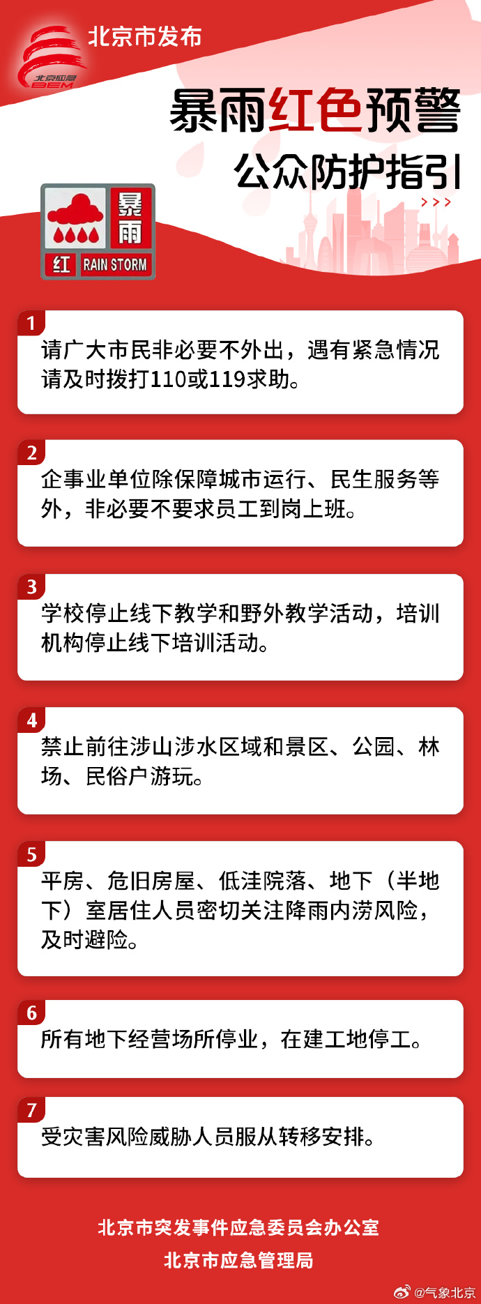 中新网8月4日电 据北京市气象局官方微博消息,北京市气象台2025年8月4日13时0分升级发布暴雨红色预警信号:预计今日午后开始,北京市将出现强降雨天气,最强降雨集中在4日18时至5日05时,该期间部分地区6小时降雨量可达150毫米以上,个别点200毫米以上,山区及浅山区出现山洪、泥石流、滑坡等灾害的风险极高,低洼地区极易出现积水,请注意防范。