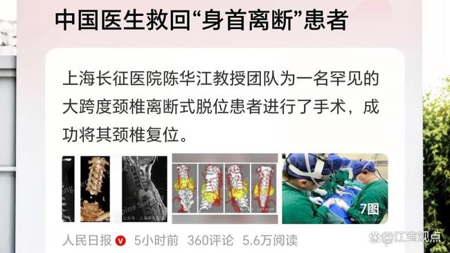 中国医生成功救治身首离断患者 医学奇迹再现!上海长征医院骨科团队成功完成了一例全球罕见的“身首离断”式颈椎重伤救治手术,为一名因颈部遭机械臂重击导致颈椎完全离断的患者重燃生命希望。这场与死神的较量背后,体现了医学技术突破与人文勇气的双重胜利。