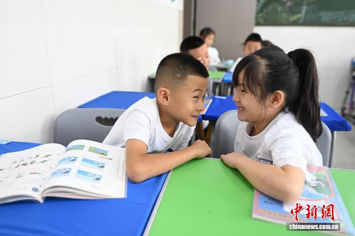 9月1日,呼和浩特市玉泉区公义店小学,一年级新生认识同桌。当日,呼和浩特市幼儿园、小学、初中、中等职业学校及普通高中高一、高二年级开学。中新社记者 刘文华摄