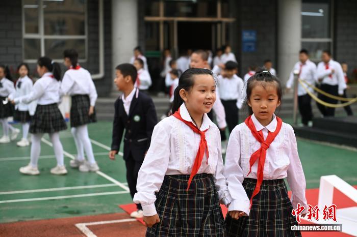 9月1日,呼和浩特市玉泉区公义店小学,小学生在开学第一天的第一个课间玩耍。当日,呼和浩特市幼儿园、小学、初中、中等职业学校及普通高中高一、高二年级开学。中新社记者 刘文华摄