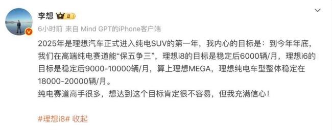 “2025年是理想汽车正式进入纯电SUV的第一年,我内心的目标是:到今年年底,我们在高端纯电赛道能“保五争三”,理想i8的目标是稳定后6000辆/月,理想i6的目标是稳定后9000-10000辆/月,算上理想MEGA,理想纯电车型整体稳定在18000-20000辆/月。纯电赛道高手很多,想达到这个目标肯定很不容易,但我充满信心!”9月1日,理想CEO李想在微博发文,正式回应了外界关于理想i6目标销量的报道。