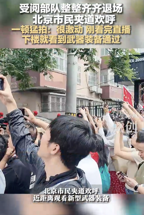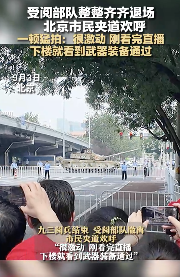 9月3日,阅兵仪式结束后,部队官兵以同样昂扬的姿态有序退场。他们保持着严整的队形,步伐铿锵有力、整齐划一,歌声飘扬。