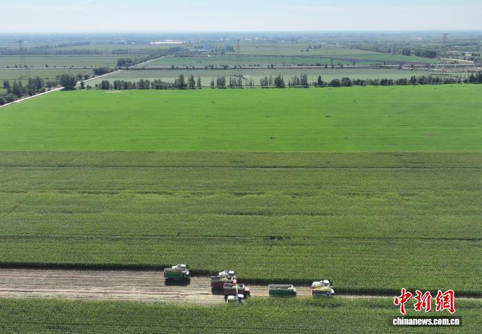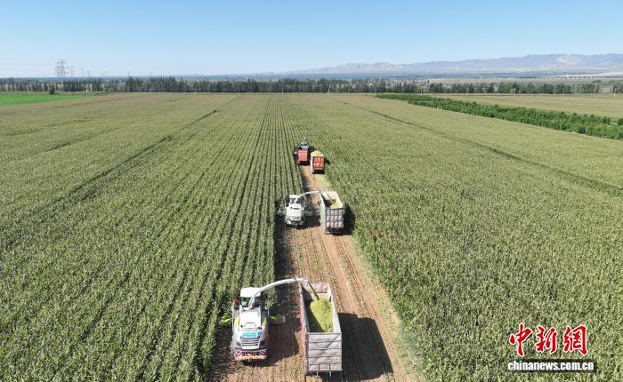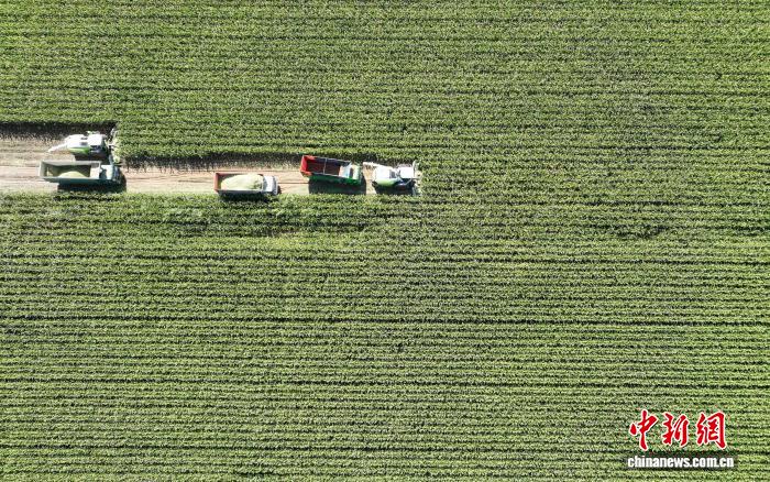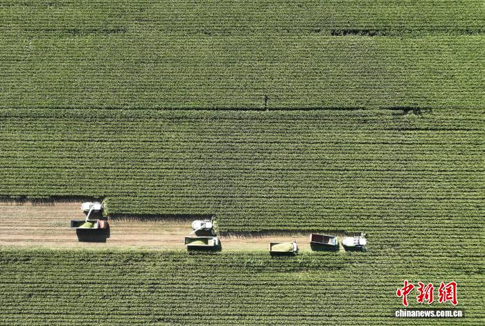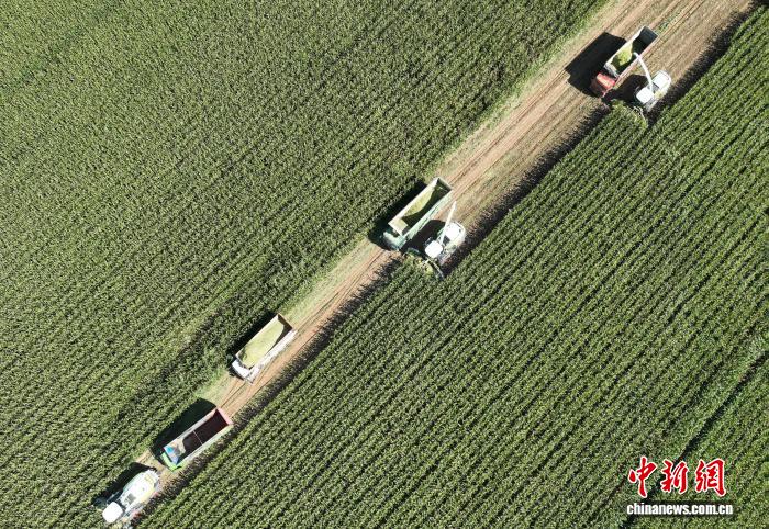 9月5日,工作人员在宁夏农垦集团有限公司平吉堡农场收割青贮玉米。当前,正值青贮玉米收获关键期,宁夏各地抢抓农时,组织农机服务队和农技人员深入田间地头,全面开展玉米青贮工作,为牲畜安全越冬备足“营养餐”。(无人机照片)中新社记者 于晶 摄