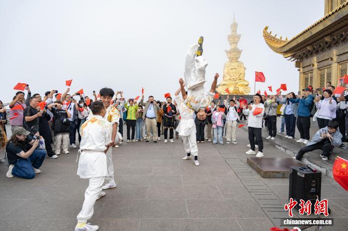 初秋的峨眉山金顶,游客登高望远,一群中外青年拍照打卡,创作武术短视频。