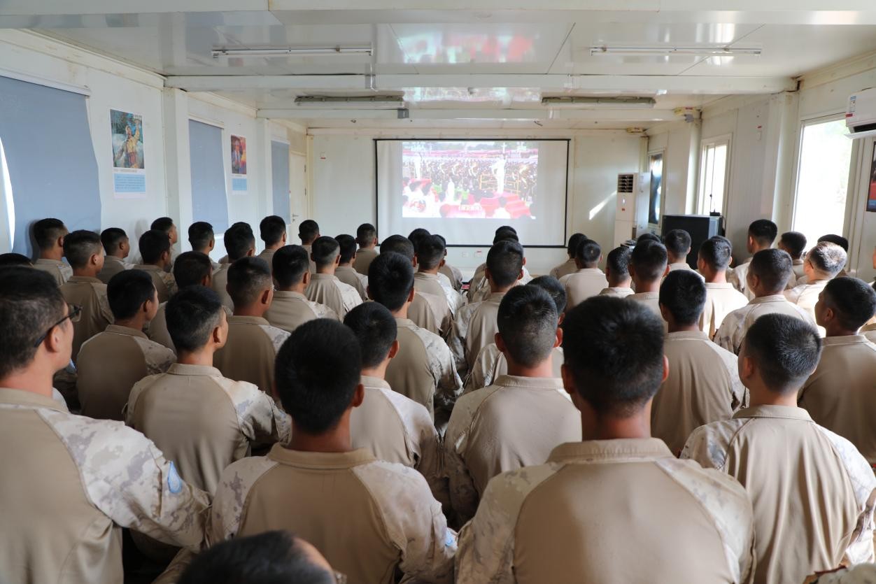中国赴南苏丹(瓦乌)维和工兵分队官兵收看纪念中国人民抗日战争暨世界反法西斯战争胜利80周年大会