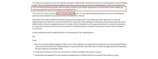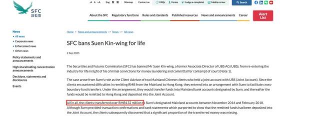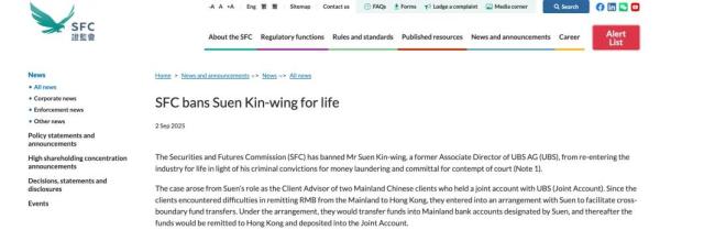 9月2日,香港证监会发布公告,对瑞银集团前副总监孙健荣作出终身行业禁入的处罚。孙健荣因涉嫌挪用客户巨额资金并从事洗钱活动,已于2024年被香港法院判处十年监禁。