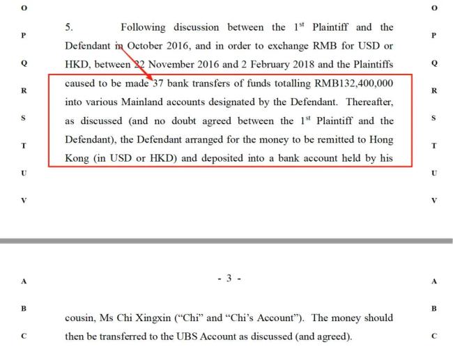 2016年11月至2018年2月期间,于氏夫妇分37次将总计1.324亿元人民币汇入孙健荣指定的多个内地账户。
