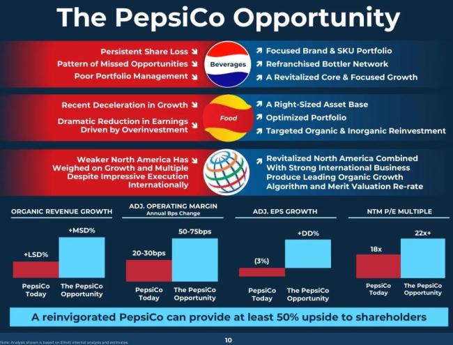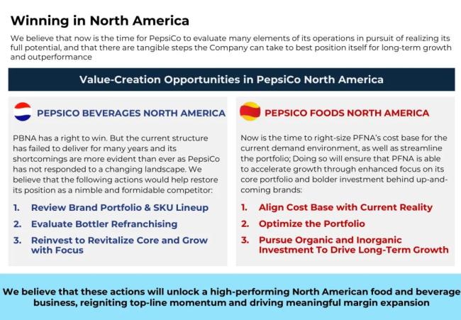 “百事公司是一家世界级公司,拥有标志性品牌和无与伦比的全球影响力。然而,该公司面临的战略和运营挑战导致财务业绩不佳、股价大幅跑输市场,并且估值明显被低估。”Elliott在报告中指出。