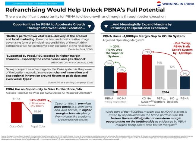 这家激进投资机构提出的核心建议是,第一,百事公司应评估对其装瓶网络重新进行特许经营(refranchising)的可能性——效仿最大竞争对手可口可乐,回到百事公司过去曾经实行过的模式,以使业务能够专注于其核心竞争力。
