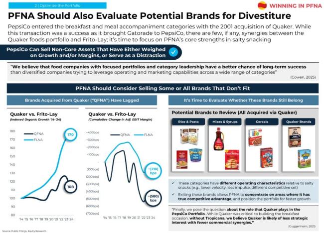“百事公司于2001年收购桂格,从而进入早餐和餐食领域。虽然这笔交易很成功,但桂格食品组合与菲多利(注:Frito-Lay,包括乐事薯片、多力多滋墨西哥玉米片、奇多奶酪零食等)之间几乎没有协同效应;是时候专注于PFNA在咸味零食领域的核心优势了。”Elliott认为。
