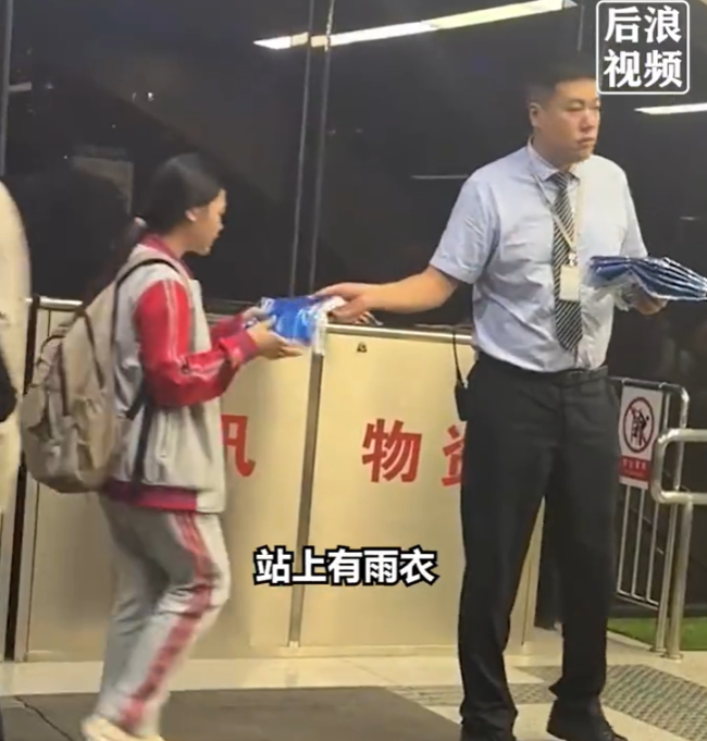 下班遇大雨地铁为乘客免费发雨衣