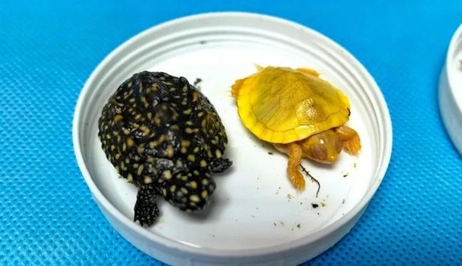 广州白云机场海关关员在对一票申报为“塑料马桶座圈套”的出境快件进行监管时,发现该快件内部填充了大量棉花,棉花包裹着5个圆柱形塑料盒,盒内均装有活体乌龟,共计52只。这些乌龟品种不一,颜色各异,主要以绿色乌龟为主,还有少量褐色和黄色乌龟。经技术机构鉴定,确认这些乌龟中包括彩龟48只、斑点池龟2只、麝香龟2只。斑点池龟和麝香龟均属于《濒危野生动植物种国际贸易公约》(CITES)附录列明的保护物种。
