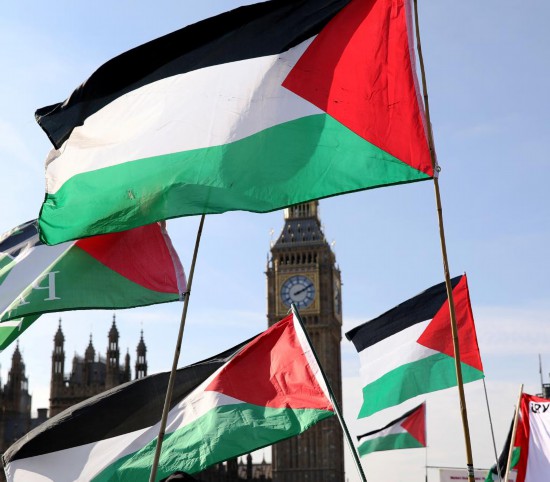 10月11日,在英国伦敦,游行队伍经过大本钟。当日,英国民众在伦敦举行游行活动声援巴勒斯坦,呼吁加沙实现持久和平。新华社记者李颖摄