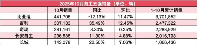 而在自主(比亚迪、吉利、奇瑞、长安自主、长城)中,仅有比亚迪一家出现了环比下滑,其余四家均有不同程度的增长。不过,从规模上来看,比亚迪以44万辆+的成绩,稳居第一;吉利反超奇瑞,以30万辆+的成绩,排在第二;而奇瑞和长安自主以20万辆+的成绩,排在第三、第四位;长城销量也增长至14万辆,但销量规模与前四家仍有较大差距。