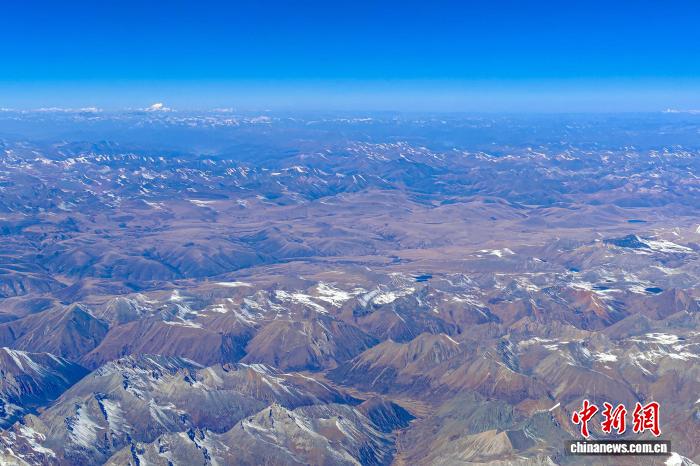 图为2024年11月13日,从出藏航班上俯瞰青藏高原,画面左上角远处是青藏高原主要山脉之一念青唐古拉山脉主峰。中新社记者 江飞波 摄