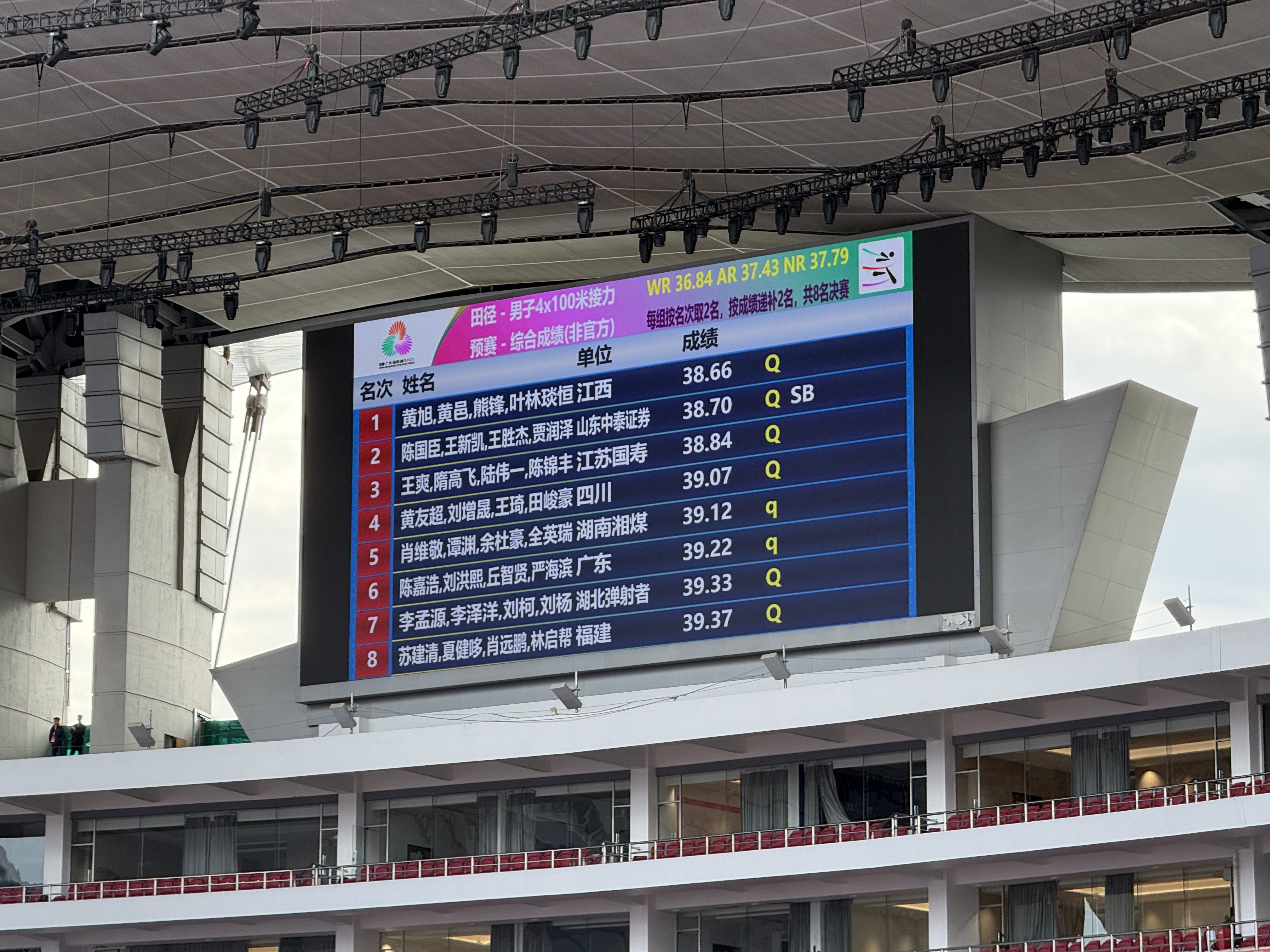 广东队的陈嘉浩、刘洪熙、丘智贤和严海滨在第二组出战,最终以39秒22的成绩排名小组第三,但因另外两组第三、四名的成绩均未超过广东队,因此广东队惊险闯进决赛。