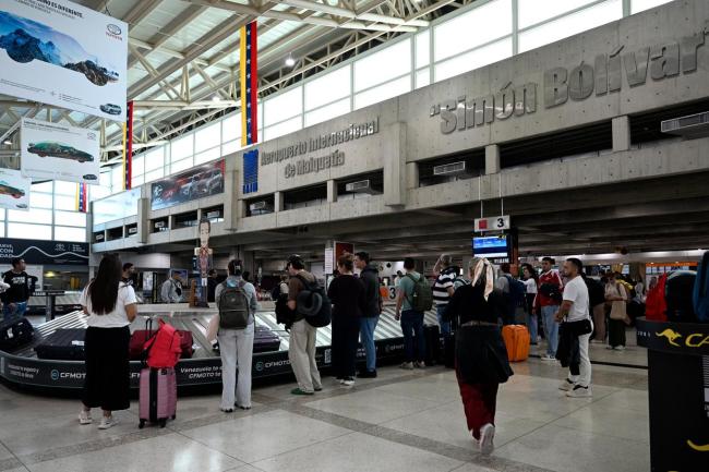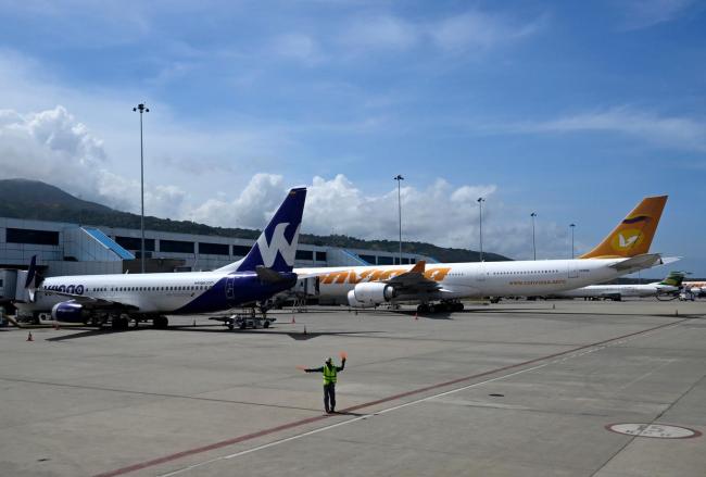 12月1日,在委内瑞拉首都加拉加斯附近的迈克蒂亚西蒙·玻利瓦尔国际机场,旅客们在等待提取行李,地勤人员则引导客机进入停机坪。当天,机场内可见来自委内瑞拉、哥伦比亚和巴拿马的航空公司客机停靠在停机坪上。