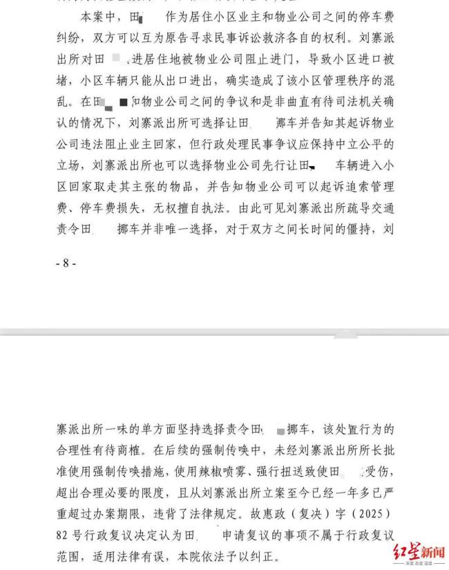 民警强制传唤致人受伤后续 法院判决警方行为违法。近日,河南郑州的田先生因与小区物业发生纠纷,车牌被“拉黑”无法出入小区,他将车停在小区入口处。田先生多次报警,警方均以民事纠纷为由未予立案。田先生称,在一次纠纷中他被民警带离时身体受伤。相关事件经过行政复议与司法诉讼,法院最终判决警方不立案行为违法,强制传唤未经所长批准,使用辣椒喷雾、强行扭送致其受伤,超出必要限度。