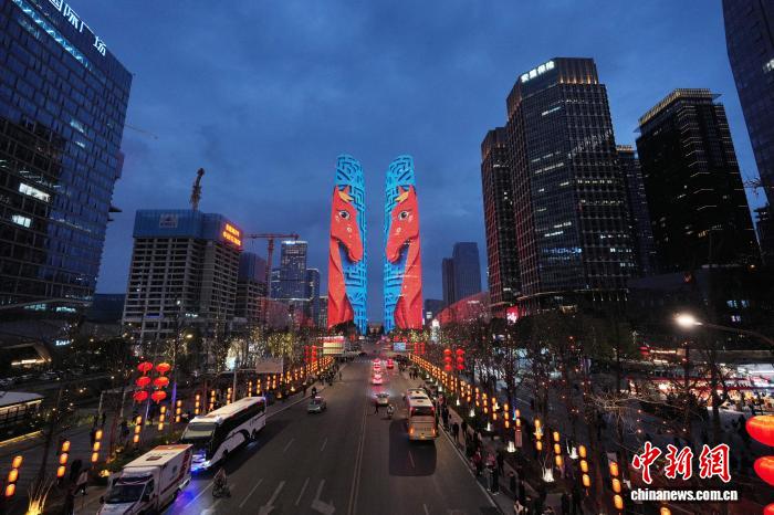 3月3日晚,四川成都,元宵节主题活动上的天府双塔主题光影秀。中新社记者 安源 摄