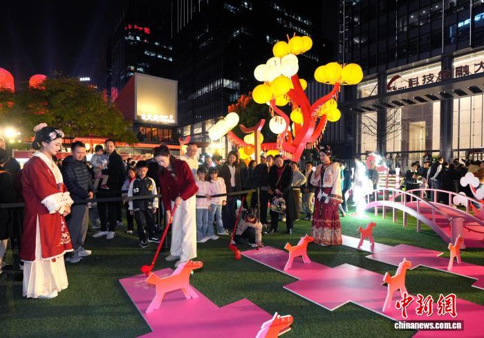 3月3日晚,四川成都,市民在元宵节主题游园会上玩游戏。中新社记者 安源 摄