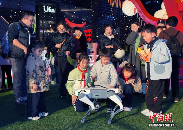 3月3日晚,四川成都,小朋友在元宵节主题游园会上与机器狗互动。中新社记者 安源 摄