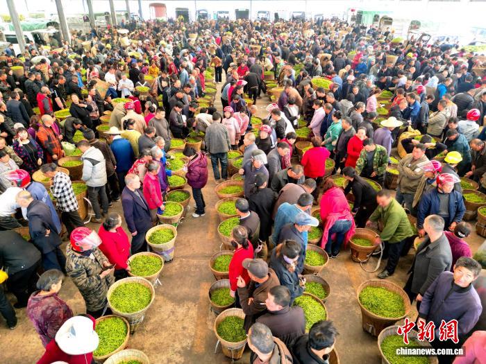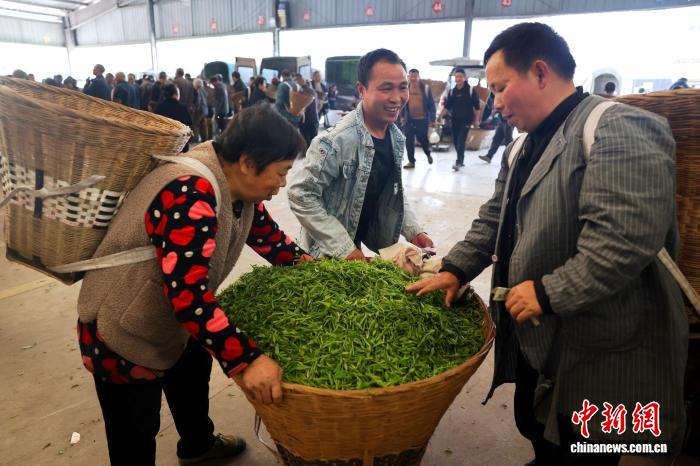 3月11日,在四川省雅安市名山区双河鲜叶交易市场和红星镇鲜叶交易市场内,随着正式开市,市场内人头攒动,呈现出购销两旺的场景。中新社记者 张浪 摄