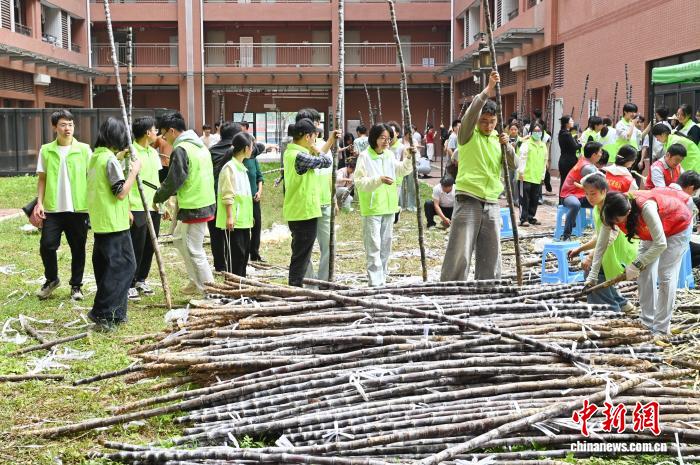 3月19日,广州市天河区,华南农业大学的师生志愿者将免费的南沙黑皮果蔗削皮。据了解,本次该校发放的爱心甘蔗共100吨,以助农惠农为初心,由南沙农业农村局捐赠。中新社记者 陈楚红 摄