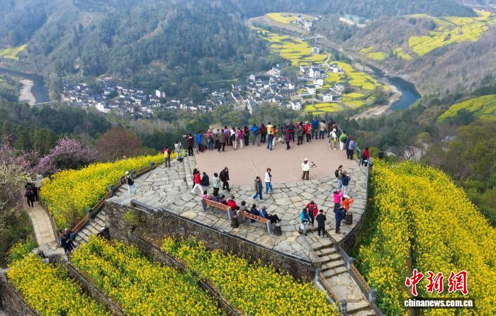 图为游客在欣赏绽放的花朵。(无人机照片)施亚磊 摄