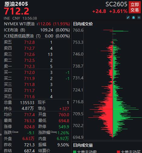 北京时间4月3日,上期所原油期货主力合约大幅高开,截至发稿涨3.61%,报712.2元/桶。
