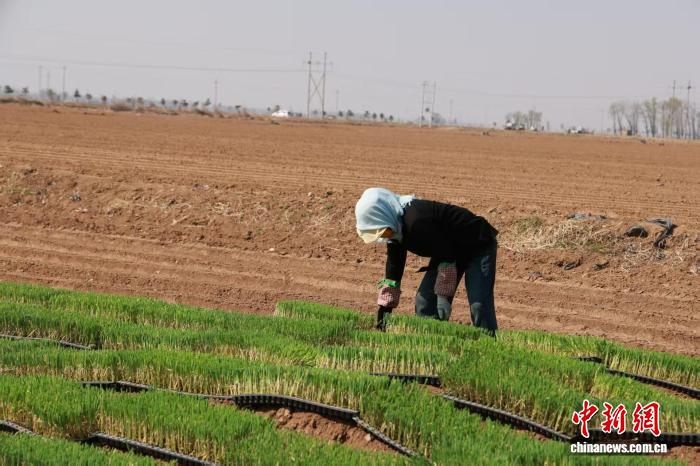 春日时节,山西省忻州市忻府区南湖村,村民们正抢抓农时,利用新技术进行葱苗移栽。张媛摄