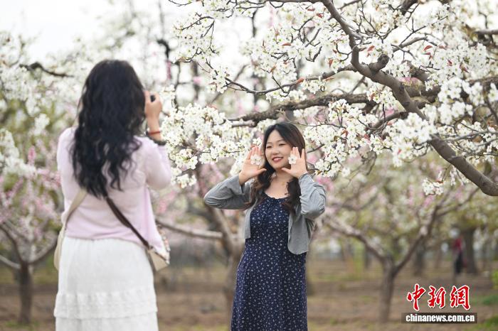 4月12日,位于甘肃省兰州市皋兰县什川古镇的万亩百年古梨园花开吸引游人踏青拍照。中新社记者 李亚龙 摄