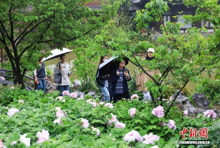 4月12日,位于浙江舟山普陀区的沈院内牡丹花盛开,吸引游人参观打卡。中新社记者 贾天勇 摄