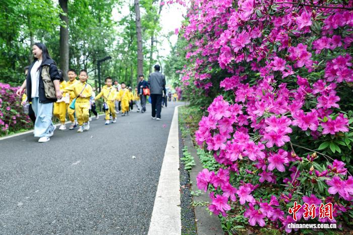 4月15日,园内盛开的杜鹃花吸引孩子们的目光。中新社记者 张畅 摄