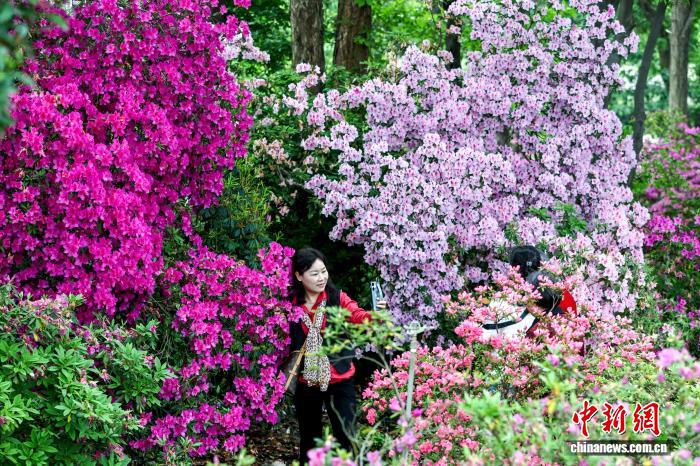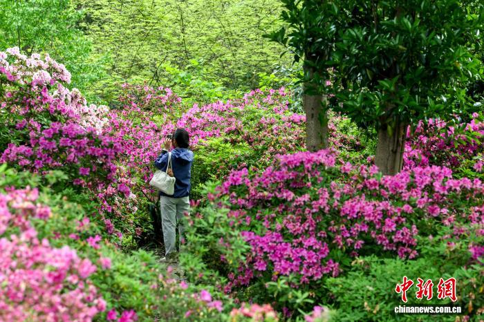 4月15日,游客在盛开的杜鹃花海里拍照。中新社记者 张畅 摄
