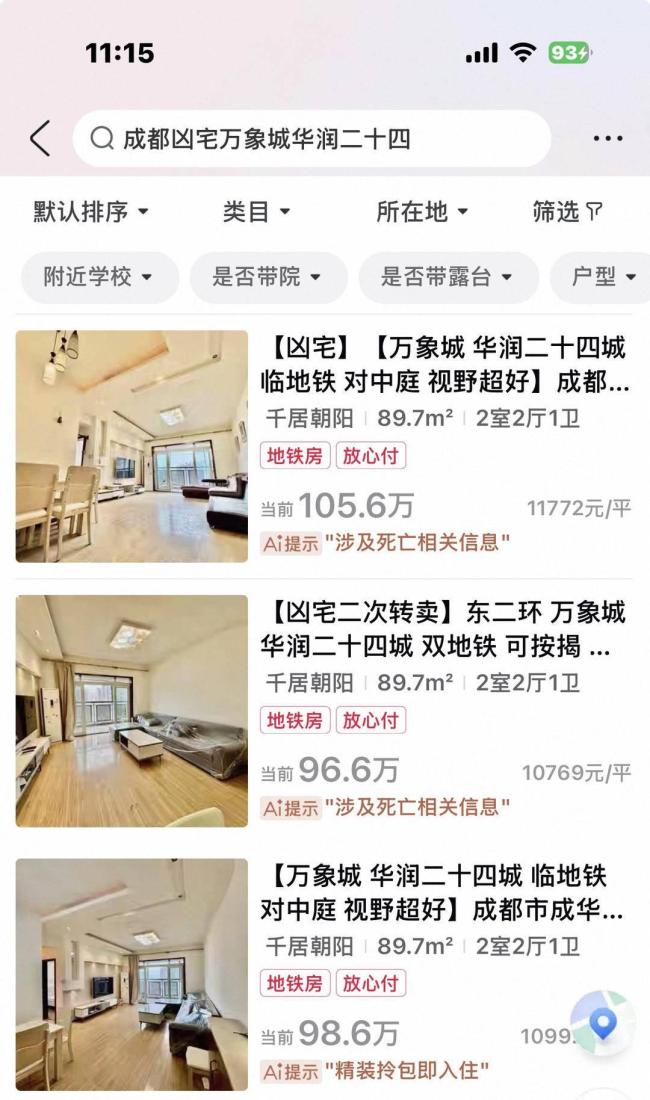 前两次拍卖主页标题均用方括号注明“凶宅”和“凶宅二次转卖”,而第三次拍卖时,主页标题未再出现“凶宅”字样。通过平台搜索,三次拍卖链接同时显示在一个页面,本次拍卖链接下方AI提示为“精装拎包即入住”,而前两次拍卖的链接则提示“涉及死亡相关信息”。