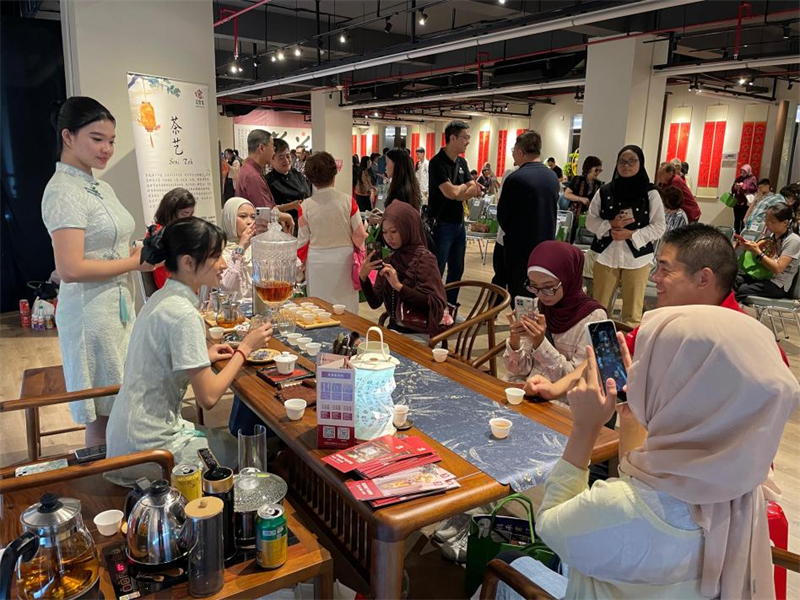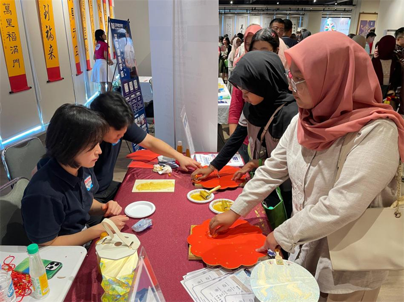 开幕式后,现场上演了精彩的文艺节目:阿拉扎大学中文系学生合唱《兰亭序》和《中国话》,印尼书画学院学生带来二胡演奏,雅加达南洋学校学生表演了笛子、古筝等中国传统乐器独奏,赢得观众阵阵掌声。演出结束后,现场观众亲身参与了书法、茶艺、汉服、拓印和漆扇制作等互动体验,让中文学习从“纸上语言”走向“可感文化”,进一步促进了两国教育与文化交流。