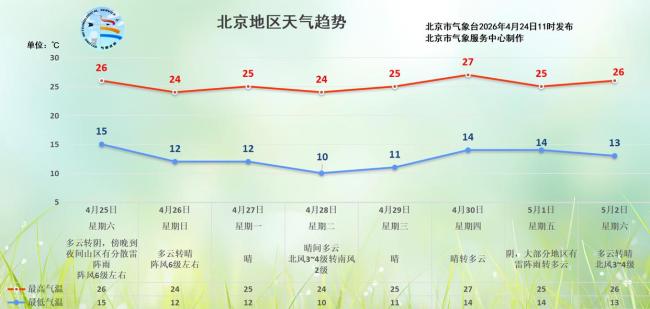 26日多云转晴;北转南风3级,阵风6级左右;平原地区最高气温24℃,山区最高气温20~22℃。夜间晴间多云;南转北风3级,阵风6级左右;平原地区最低气温12℃,山区最低气温8~10℃。