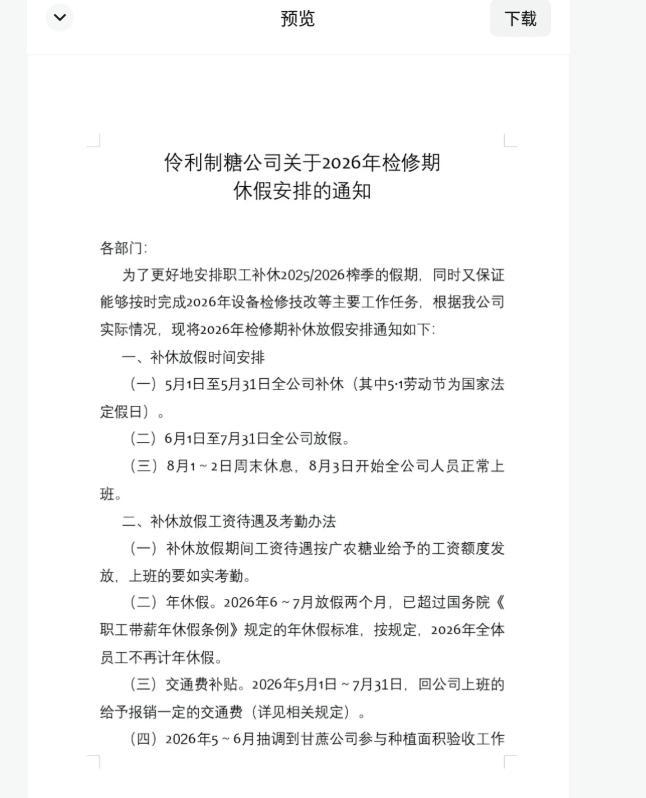 根据网帖配图,该企业为了更好地安排2025/2026榨季后的检修工作,在完成设备检修任务的前提下,对员工实行集中补休放假。具体安排为:5月1日至5月31日为补休期(含法定节假日),6月1日至7月31日全公司继续放假(含年休假),8月初恢复正常上班。文件还提到补休放假期间工资待遇按相关标准发放,并对交通补贴作出说明。