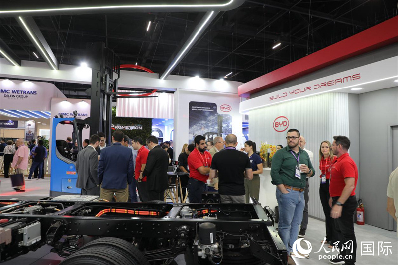 比亚迪展台前人流不断,吸引众多参观者驻足洽谈。 人民网记者 陈一鸣摄