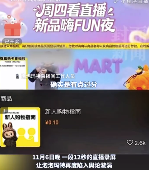 泡泡玛特会重蹈花西子79元覆辙吗?媒体评:喜欢泡泡玛特不是做冤大头 11月6日晚,泡泡玛特一段12秒的直播录屏在网络流传。视频显示,当晚23:35,泡泡玛特泡泡抽盒机小程序直播间内,直播结束后,画面未及时切断,一名女工作人员手持品牌挂链直言“妈呀,这东西卖79元确实是有点过分了”,身旁男同事则回应“没事,会... 11-07