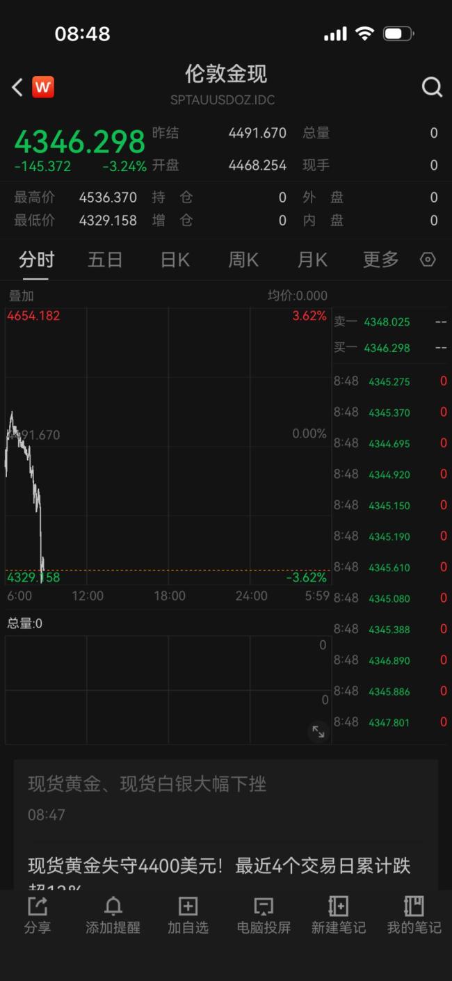 黄金白银,暴跌 贵金属价格崩盘 3月23日早盘,贵金属价格大幅下跌,黄金和白银跌幅均超过3%。截至早上8:48,伦敦现货黄金下跌3.24%,暂报4346美元/盎司附近;现货白银下跌3.59%,暂报65.462美元/盎司。金价连续下跌后,金店买进的人多了起来 03-23