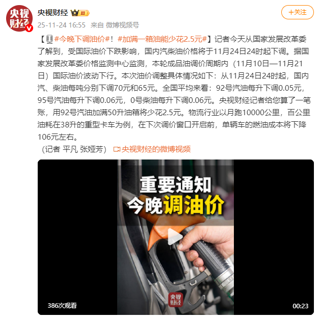 今晚下调油价 加满一箱少花2.5元 每升降约0.05元 国家发展改革委宣布,受国际油价下跌影响,国内汽柴油价格将于11月24日24时起下调。本轮成品油调价周期内(11月10日—11月21日)国际油价波动下行。具体调整为:从11月24日24时起,国内汽、柴油每吨分别下调70元和65元 11-24
