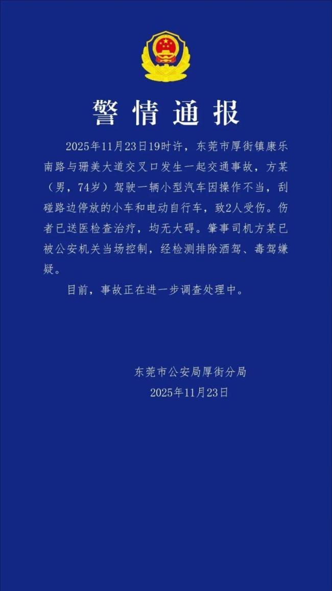 74岁男子驾车操作不当致2伤被抓 事故现场控制及时 11月23日晚,广东省东莞市公安局厚街分局通报了一起交通事故。当天19时许,在东莞市厚街镇康乐南路与珊美大道交叉口,一名74岁的男性驾驶员方某因操作不当,导致其驾驶的小型汽车刮碰了路边停放的几辆小车和电动自行车,事故造成两人受伤 11-24