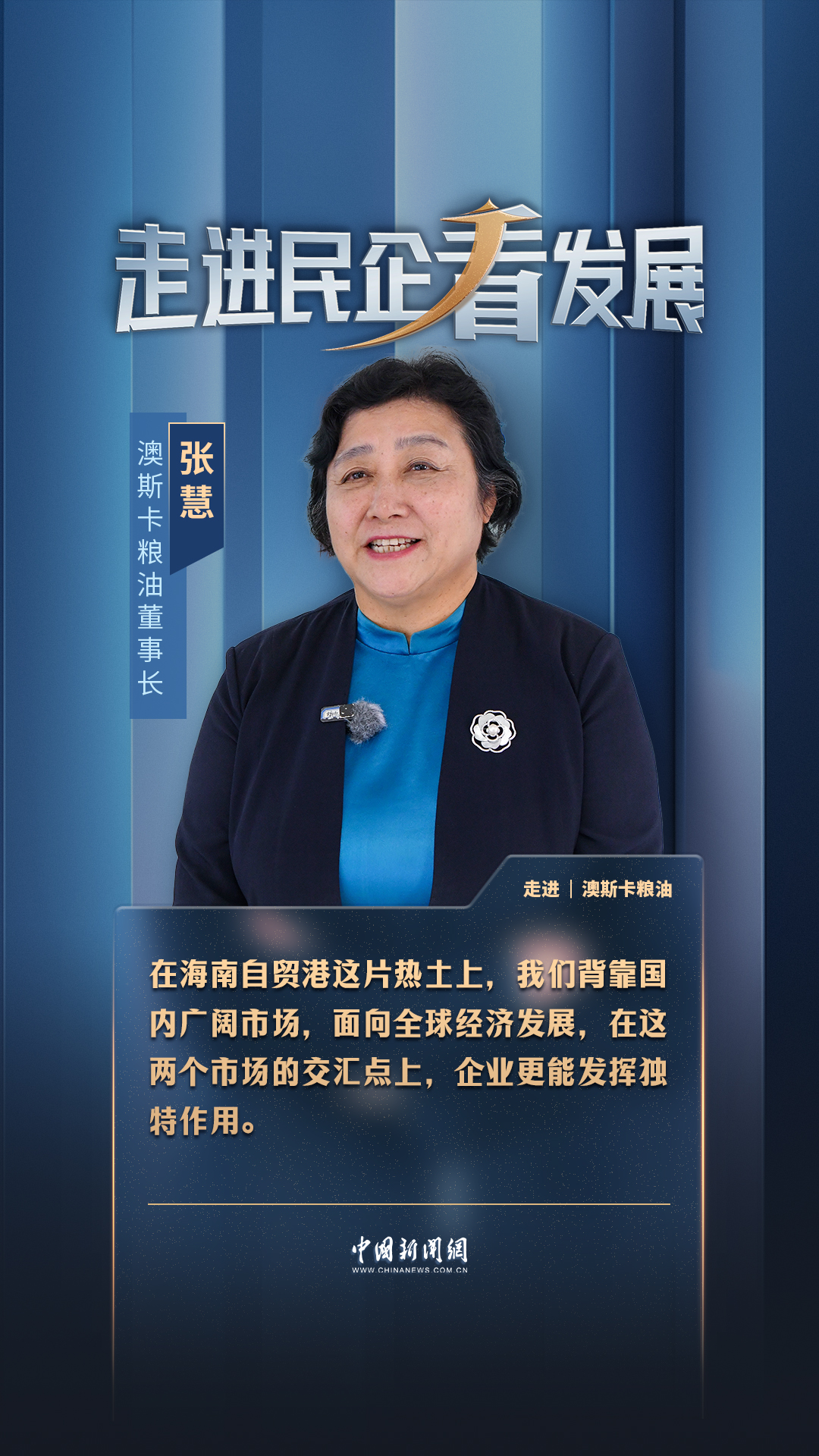 走进民企看发展 | 澳斯卡粮油董事长张慧:在海南自贸港闯出一条路来 中新网海口11月5日电 (记者 王子谦)“在海南自贸港这片热土上,我们背靠国内广阔市场,面向全球市场发展,在这两个市场的交汇点上,企业更能发挥独特作用。”澳斯卡粮油董事长张慧近日在接受中新网专访时坦言,面对海 11-05
