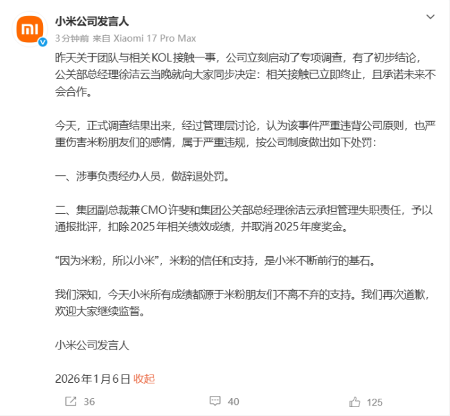 小米徐洁云被通报批评 管理失职受罚! 小米公司发言人于1月6日在微博上宣布,针对此前团队与相关KOL接触一事,公司已启动专项调查,并得出初步结论。公关部总经理徐洁云表示,相关接触已立即终止,并承诺未来不会合作 01-07